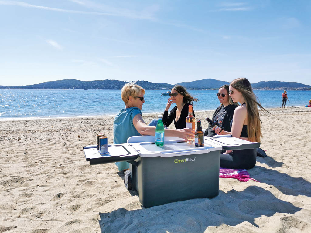 Green Akku zeigt einen neuen Kompressor-Kühlbox mit integriertem 48 Amperestunden großem Lithium-Akku, die sich zum Picknick-Tisch aufklappen lässt und zudem über Bluetooth-Speaker und vier USB-Ports verfügt. Eine Besonderheit der Kühlbox ist ihr zweiteiliger Deckel. Er lässt sich zu beiden Seiten aufklappen und verwandelt die Kühlbox mit einer zusätzlichen Plexiglasplatte als Abdeckung über dem Kühlfach mit nur wenigen Handgriffen in einen kleinen Campingtisch. Die seitlichen Tragegriffe dienen dabei als Stütze.