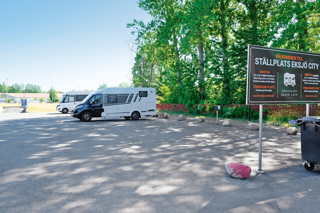 Karhulavägen 1, S-57531 Eksjö, www.stallplatseksjo.se, 212 m über NN 14 Plätze bis 9 m auf Asphalt; 225 SEK inkl. Frischwasser und Strom, keine Entsorgung. Sehr zentrumsnah, weniger gemütlich. Online Platz auswählen und bezahlen. Supermärkte (ICA/Lidl) in der Nähe. Für schwedische Verhältnisse enge, dafür ebene Plätze.