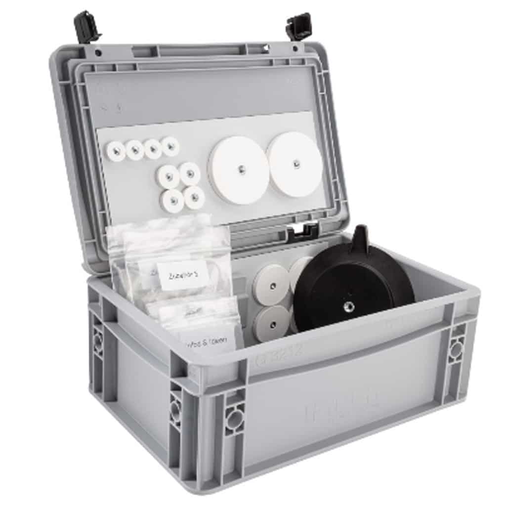 Enthalten sind fünf beidseitig haftende Magnete mit einer Haltekraft von je 400 Gramm sowie zwölf Magnetsysteme mit unterschiedlichen Durchmessern und einer Haltekraft von je 3,8 bis 40 Kilogramm. Das Zubehör besteht aus praktischen Utensilien wie selbstklebendem Metallband, selbstklebenden Metallscheiben, Ösen und Haken.