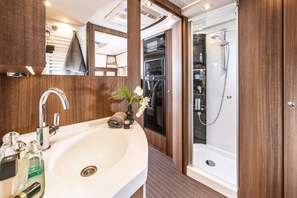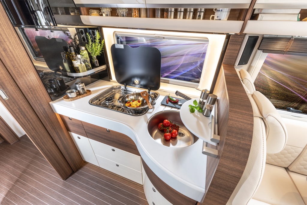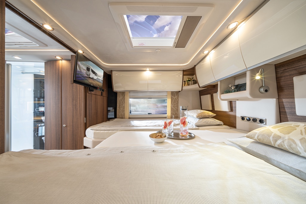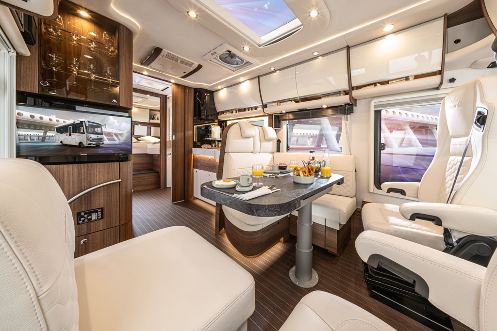 Diese Luxus-Ausstattung setzt sich im Inneren des Fahrzeugs fort: Der Möbelbau basiert auf der „Jatoba Brilliant“-Ausführung. Dazu kommt die spezielle Polsterung „Diamond-Series Vanille“ mit Fahrerhaus-Schwing-Sitzen in Sonderlederausführung.