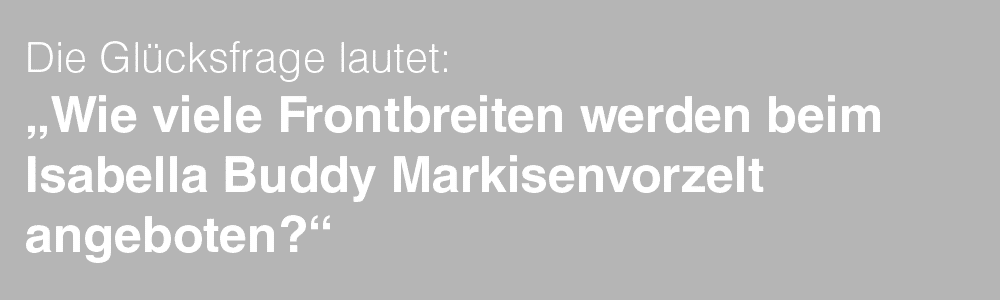 Die Vorderfront wird in die Frontblende der Markise eingezogen und per Reißverschluss mit den Seiten verbunden. Schneller und einfacher geht es nicht! Egal ob Sie eine Wandmarkise am Wohnmobil oder eine Dachmarkise auf Ihrem Campervan haben, das „Buddy“ passt fast immer solange Sie eine Montagehöhe (Markisenunterkasten) zwischen 240 cm bis 275 cm haben.