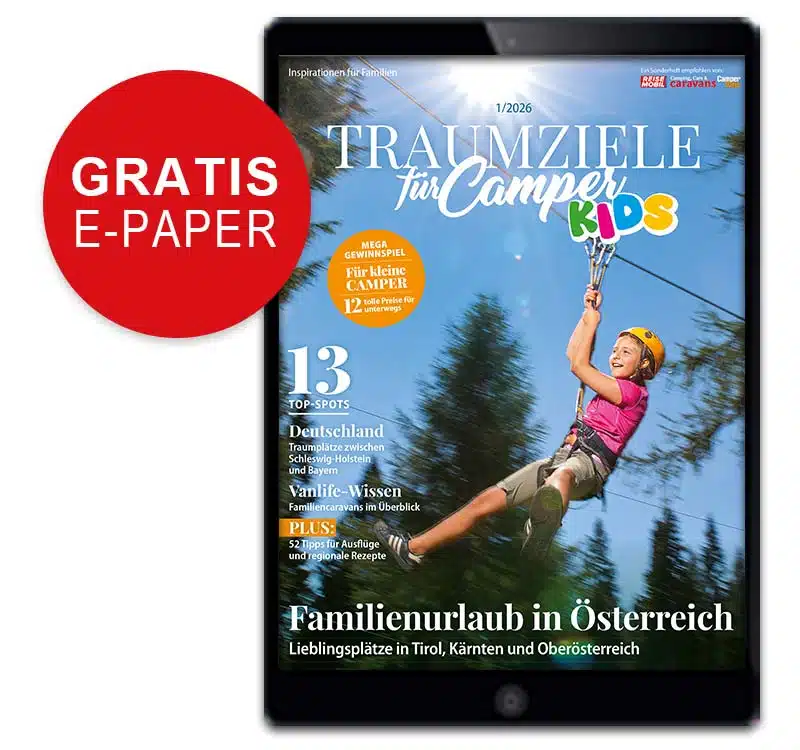 Die Traumziele für Camper Kids 1/2026 nimmt Sie mit zu den schönsten Plätzen für den Urlaub auf vier Rädern. Im Heft warten 13 Top Spots für Familien in Deutschland, Österreich und der Schweiz auf Sie! Dazu kompaktes Vanlife-Wissen rund um Familiencaravans sowie 52 Ideen für Ausflüge und regionale Rezepte, die im Camper genauso gut gelingen wie zu Hause.