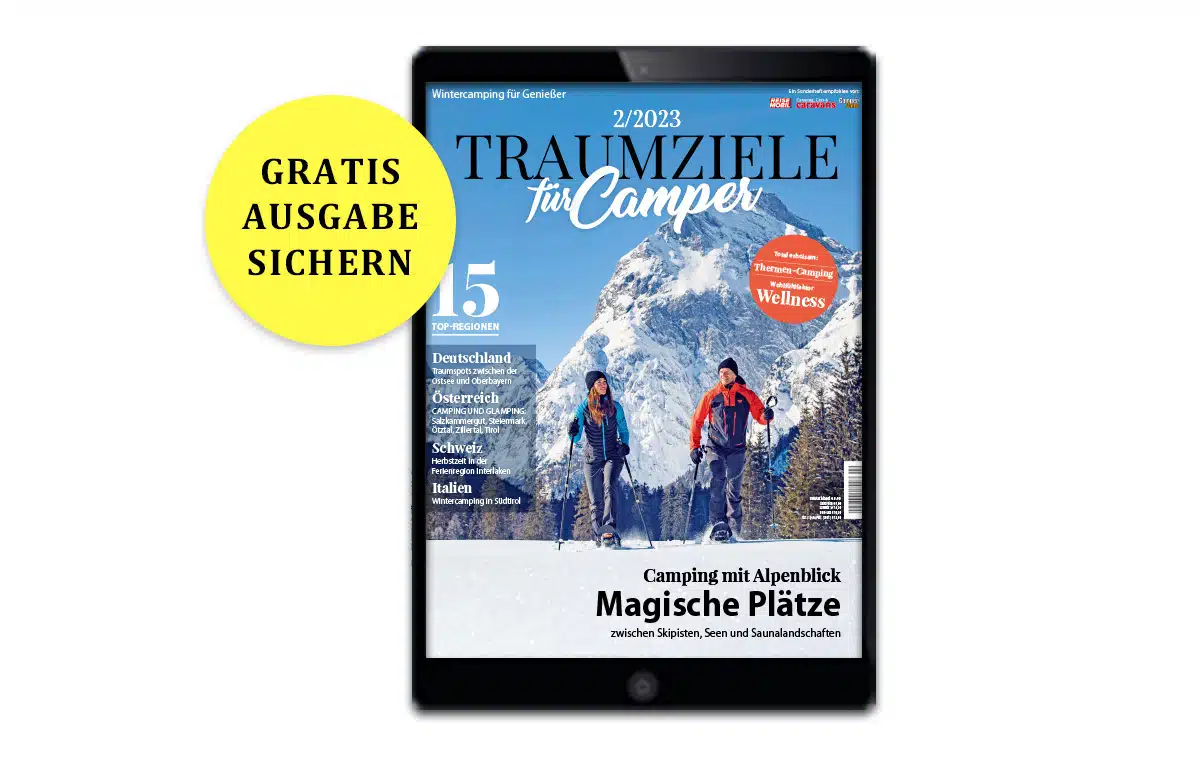 Als Leser von Reisemobil International schenken wir Ihnen die brandneue Ausgabe „TRAUMZIELE für Camper 2/2023″ im praktischen E-Paper-Format (Wert: 8,90 Euro).