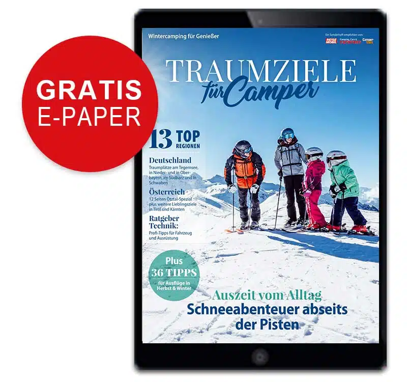 Die Winterausgabe von Traumziele für Camper entführt Sie in 13 ausgewählte Regionen in Deutschland und Österreich, die wie geschaffen sind für genussvolles Wintercamping. Vorgestellt werden stimmungsvolle Wohlfühl-Campingplätze am Tegernsee, in Nieder- und Oberbayern, im Südharz, in Schwaben sowie ein großes Ötztal-Spezial und weitere Highlights in Tirol und Kärnten. Dazu inspirieren zahlreiche Ideen für Ausflüge und Erlebnisse in Herbst und Winter, die Lust auf besondere Momente in der Natur machen.