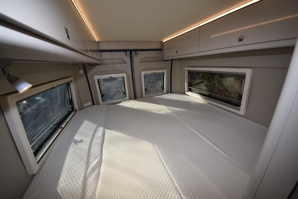 Mit dem C 540, C 600 und C 640 feiern drei Grundrisse auf der CMT in Stuttgart Premiere. Die Konstrukteure des Kastenwagens legten den Fokus auf Ergonomie, Design und intelligente Raumnutzung, – Aspekte, die bei der jüngeren Zielgruppe punkten sollen. So sind Isofix-Verankerungen für zwei Kindersitze serienmäßig. Bürstner hat das Dach des Basis-Fiat ausgeschnitten. Dies ermöglicht einen leichteren Durchgang vom Wohnraum ins Fahrerhaus. Zusätzlich schafft dieser Schritt bei gedrehtem Fahrersitz mehr Kopffreiheit. Das optionale und beheizbare Schlafdach ist für alle drei Grundrisse zu haben. Bei einem Liegemaß von 197 mal 128 Zentimeter und einer Belastbarkeit von etwa 300 kg, lässt es sich komfortabel nächtigen. Serie ist die Beleuchtung mit einer Schwanenhalsleuchte. Für Wohlfühltemperatur im Dach sorgt ein integrierter Heizlüfter. Der Außenrahmen des Daches wird in Wagenfarbe lackiert und sorgt für ein homogenes äußeres Erscheinungsbild.