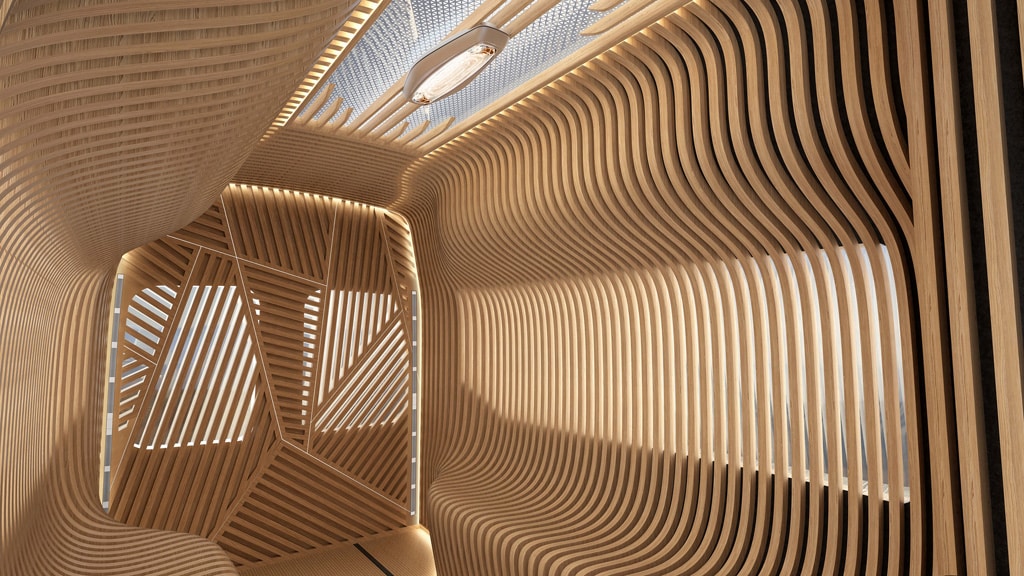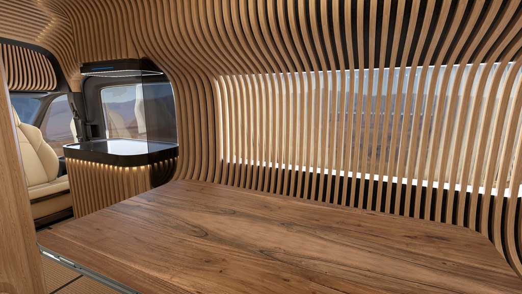 Das Innenraumdesign besteht aus Akustik-Panelen, die fließend in eine Face-to-Face Sitzbank übergehen. Die Schlafplätze sind versteckt, hochmoderne Soundsysteme und eine indirekte LED-Beleuchtung sorgen für die entsprechende Stimmung.