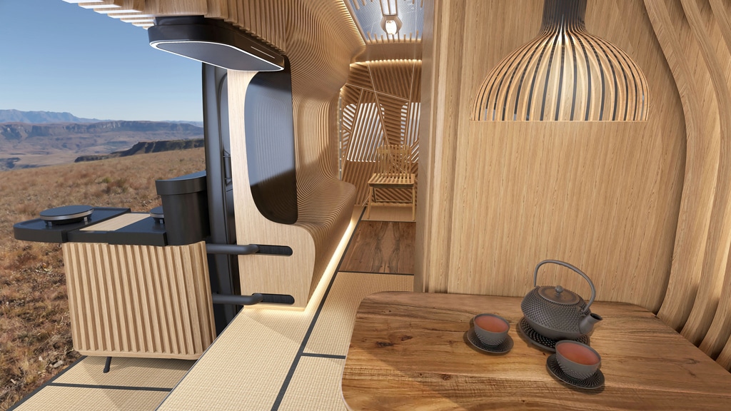 Der Blick hinein zeigt: Für das Einrichtungskonzept hat sich Alpine an den japanischen Konzepten des Minimalismus und der Ästhetik durch Ordnung orientiert. Das bietet mehrere Vorteile: Bei Bedarf sind Gegenstände schnell zur Hand und sind während der Fahrt sicher verstaut und bei Nichtgebrauch aus dem Blick. Gleichzeitig wirkt eine aufgeräumte, harmonische Inneneinrichtung professionell und entspannend – verstärkt wird das Gefühl durch japanische Tatamimatten als Bodenbelag.