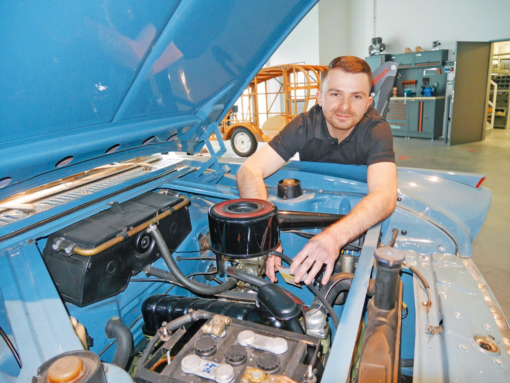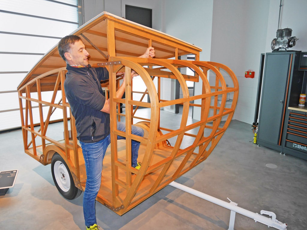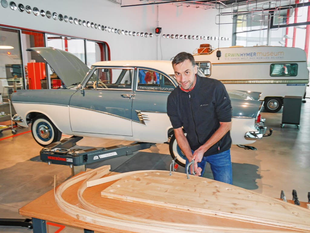 So ist zum Beispiel das Hymermobil 520 D von 1976, das auf seine Durchsicht wartet, für die Werkstatt eher eine Zierde denn ein Objekt für die Reparatur. Blicke zieht auch der Ford Taunus 17 m P2 de luxe auf sich, der auf der nagelneuen Hebebühne knapp über dem makellosen Boden schwebt. „Die Bühne schafft locker Reisemobile bis fünf Tonnen“, versichert Marco Ruf. Der Kfz-Meister gehört dem Kernteam ebenso an wie Andreas Krattenmacher. Der gelernte Schreiner widmet sich Holzarbeiten wie an dem nachgebauten Gerippe des Eriba Tourist, Schaustück des Museums und zum Aufpolieren in der Werkstatt.