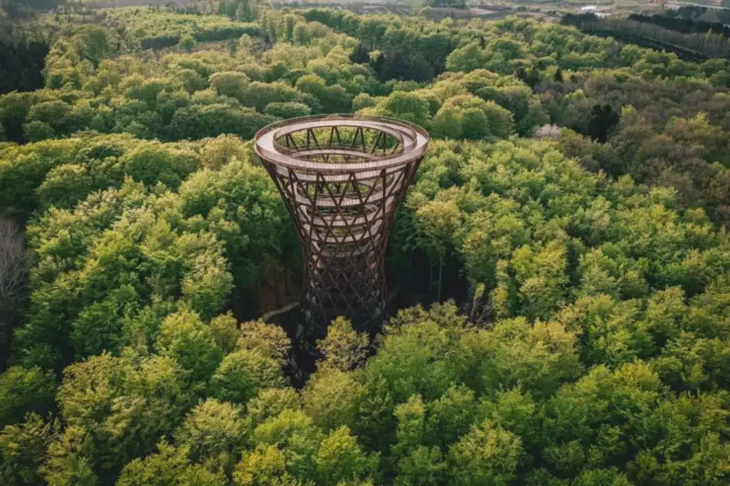 Schritt für Schritt gen Himmel. Oben, in 140 Meter Höhe, schweift der Blick über Baumkronen und bei guter Sicht sogar bis ins über 50 Kilometer entfernte Kopenhagen und Malmö. Die Rede ist vom 45 Meter hohen, spiralförmigen Aussichtsturm – dem Aushängeschild und Wahrzeichen vom Naturpark Camp Adventure im dänischen Ort Rønnede.