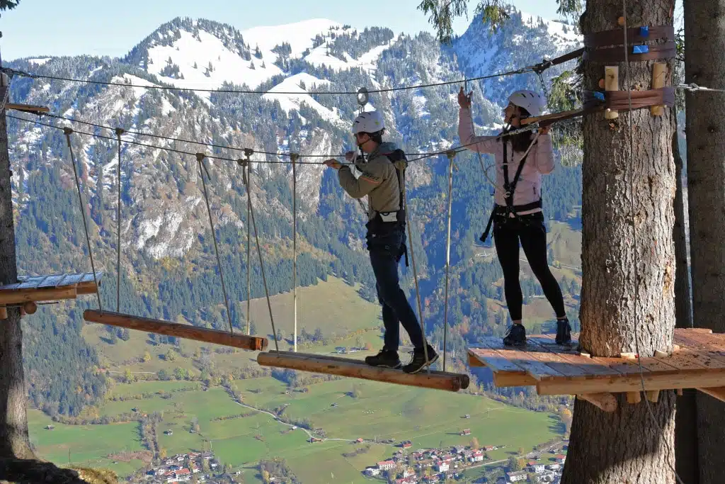 Nach anderthalb Jahren Bauzeit ist die Bergstation der Hornbahn Hindelang um eine weitere Attraktion reicher. Auf 8.000 Quadratmetern ist der Waldseilgarten Bad Hindelang mit 70 Stationen und neun Parcours entstanden. Zu den typischen Elementen gehören Seile zum Schwingen, Hängebrücken und Netze. Die Hornbahn Hindelang bringt Gäste in modernen Achterkabinen hinauf zur auf 1.320 Meter über NN gelegenen Bergstation.