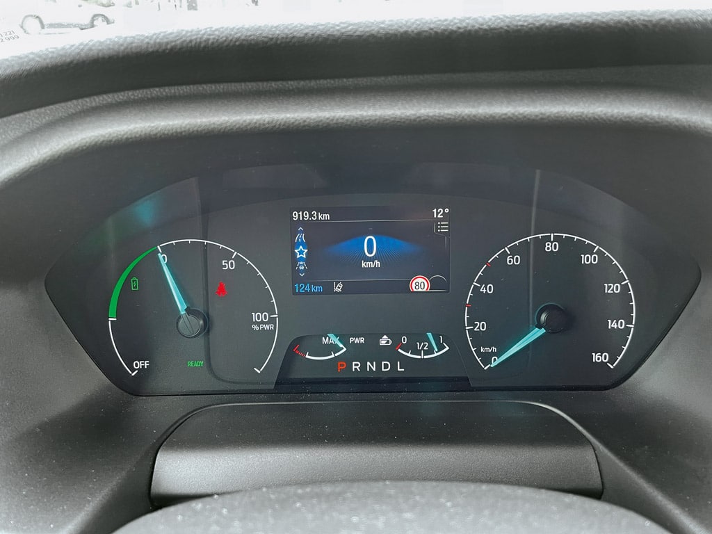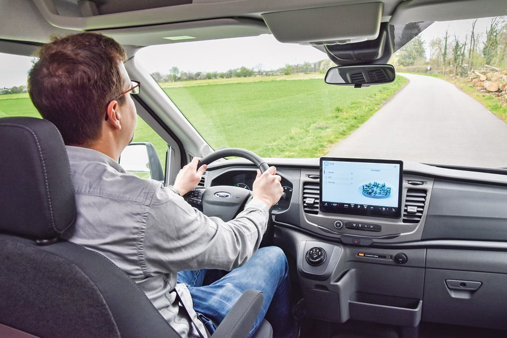 Aber wie gesagt, die flotte Fahrt im elektrischen Kastenwagen stimmt durchaus optimistisch. Das sofort anliegende Drehmoment gibt Selbstvertrauen, zumal der eTransit die 430 Newtonmeter dank einer aufwendigen, schraubgefederten Schräglenker-Hinterachse souverän auf die Straße bringt. Motor und Einzelradaufhängung stammen vom elektrischen Mustang und bescheren dem Fahrzeug zweifelsohne klassenbeste Fahreigenschaften. Netter Nebeneffekt der polterfreien Hinterachse sind weniger harte Stöße auf den Möbelbau des Prototypen – wobei der stumme Abtrieb wiederum nach einem besonders klapperfeien Mobiliar verlangt. Das Thema bleibt auf jeden Fall spannend!