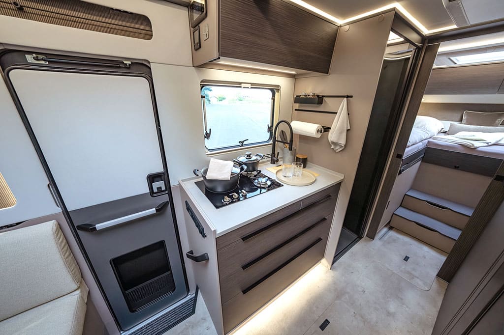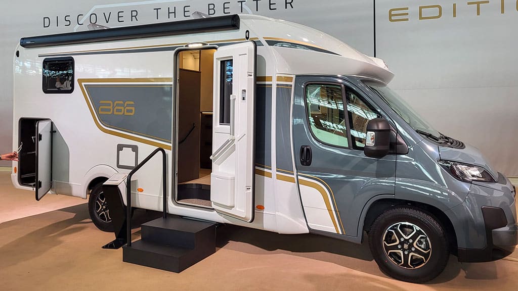 Zum 45. Geburtstag präsentiert Le Voyageur die 7.8 Eterna 45th Edition auf dem Caravan Salon 2025. Der 7,85 Meter lange Teilintegrierte verfügt über Heck-Einzelbetten, eine Face-to-Face-Sitzgruppe im Bug, Kompaktbad mit Toilette und großzügiger Dusche in der Mitte sowie eine Küchenzeile mit 174-Liter-Kühlschrank.