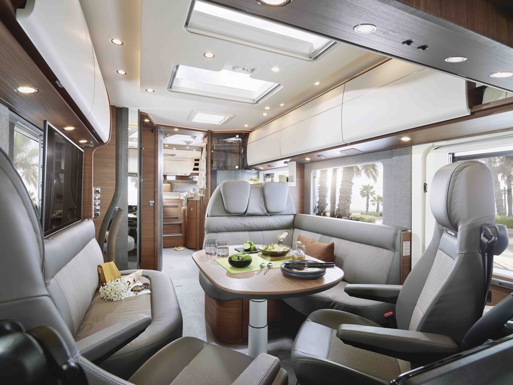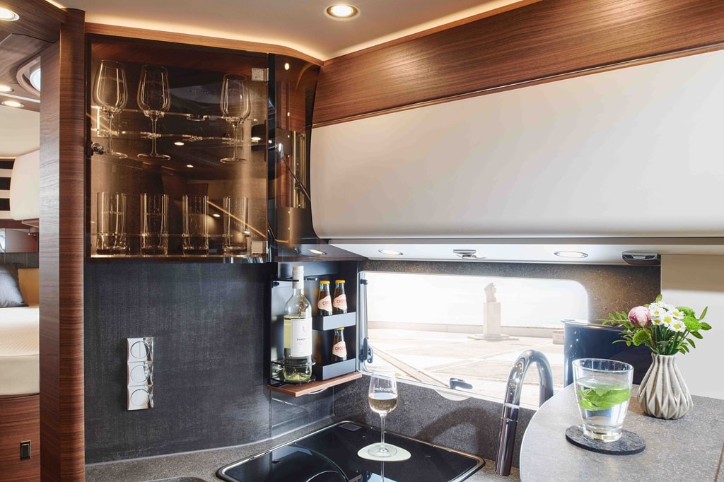 Die Wohnsitzgruppe bietet durch einen verkürzten L-Schenkel mehr Bewegungsfreiheit; optional bleibt die verlängerte Variante verfügbar. Neu ist zudem eine textile Fenster- und Wandverkleidung in Anthrazit. Auch die Küche wurde weiterentwickelt: Eine schwebende Arbeitsplatte in Natursteinoptik sowie ein beleuchteter Design-Barschrank sorgen für Komfort und optische Akzente. Der Premium-Waschraum punktet mit einer neu gestalteten Dusche inklusive indirekter Beleuchtung.