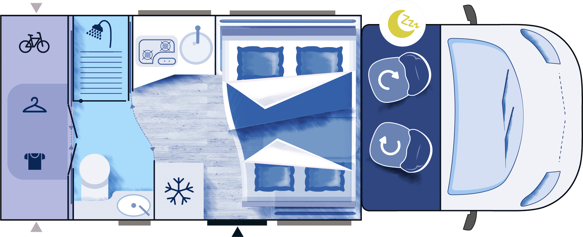 Hinten bietet sich unwahrscheinlich viel Platz: eine breite Dusche mit doppelter Belüftung (Dachhaube + Fenster), zwei Türen mit großen Spiegeln, die Zugang zum Ankleideraum gewähren und unterhalb des Ankleideraums eine geräumige beheizte, beleuchtete Garage, die Platz für zwei E-Fahrräder bietet, welche über die elektrischen Anschlüsse bequem aufgeladen werden können.