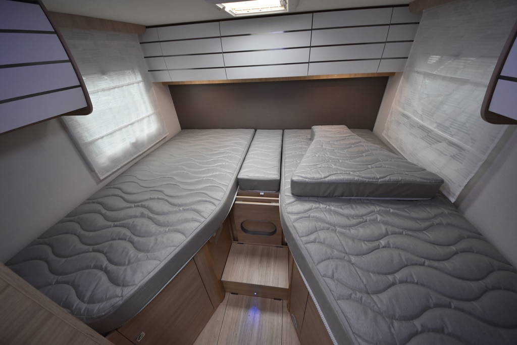 Per Knopfdruck lässt sich mit einem optionalen Hubbett (790 Euro Aufpreis) zusätzlicher Schlafplatz schaffen. Neu ist das in Holzdekor gehaltene, helle Interieur bei weißen GFK-Wänden in der Basis-Variante. Die Queensbett- und Einzelbettenvariante bietet viel Platz über dem Bett aufgrund der Heckabsetzung. In der 1,20 Meter hohen Garage lassen sich dennoch problemlos Fahrräder transportieren.