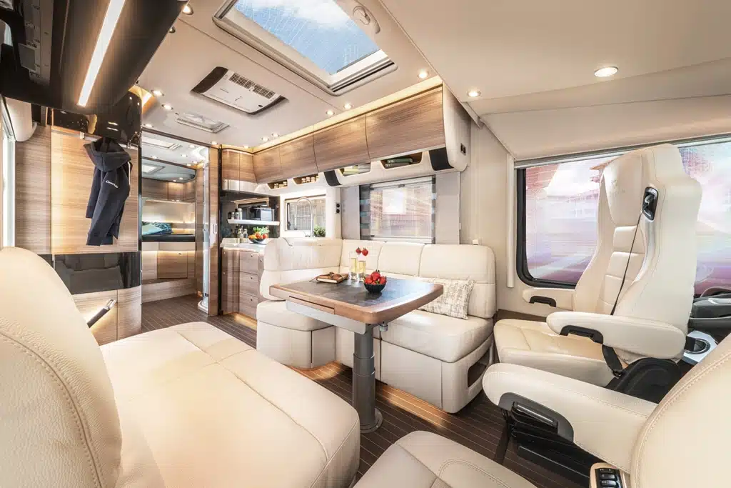 Auf ein edles Erscheinungsbild setzt Concorde im Innenraum des Charisma. Die Schrankfronten bekommen auf Wunsch ein zweifarbiges Design, die Ablagen unter den Oberschränken sind mit Leder bezogen. An zahlreichen Details merkt man die Nähe zum großen Bruder Centurion, etwa im Bad mit in die Wand integriertem Handtuchwärmer.
