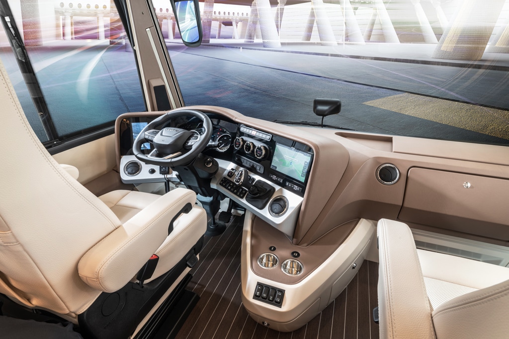 Der Charisma basiert auf dem Iveco Daily mit 6,5 Tonnen zulässiger Gesamtmasse. Das Armaturenbrett ist nach oben und vorn versetzt, sodass zum einen ein maximal langer Wohnraum entsteht, zum anderen der von Concorde bekannte hohe Doppelboden, der sich über die Außenklappen von beiden Seiten erreichen lässt. Hier baut der Hersteller beispielsweise auch Heizung und Ablassventile ein. Der optionale Gastank verbirgt sich hinter einer Klappe in der Seitenschürze. Die Elektrik ist übersichtlich in der Garage installiert.