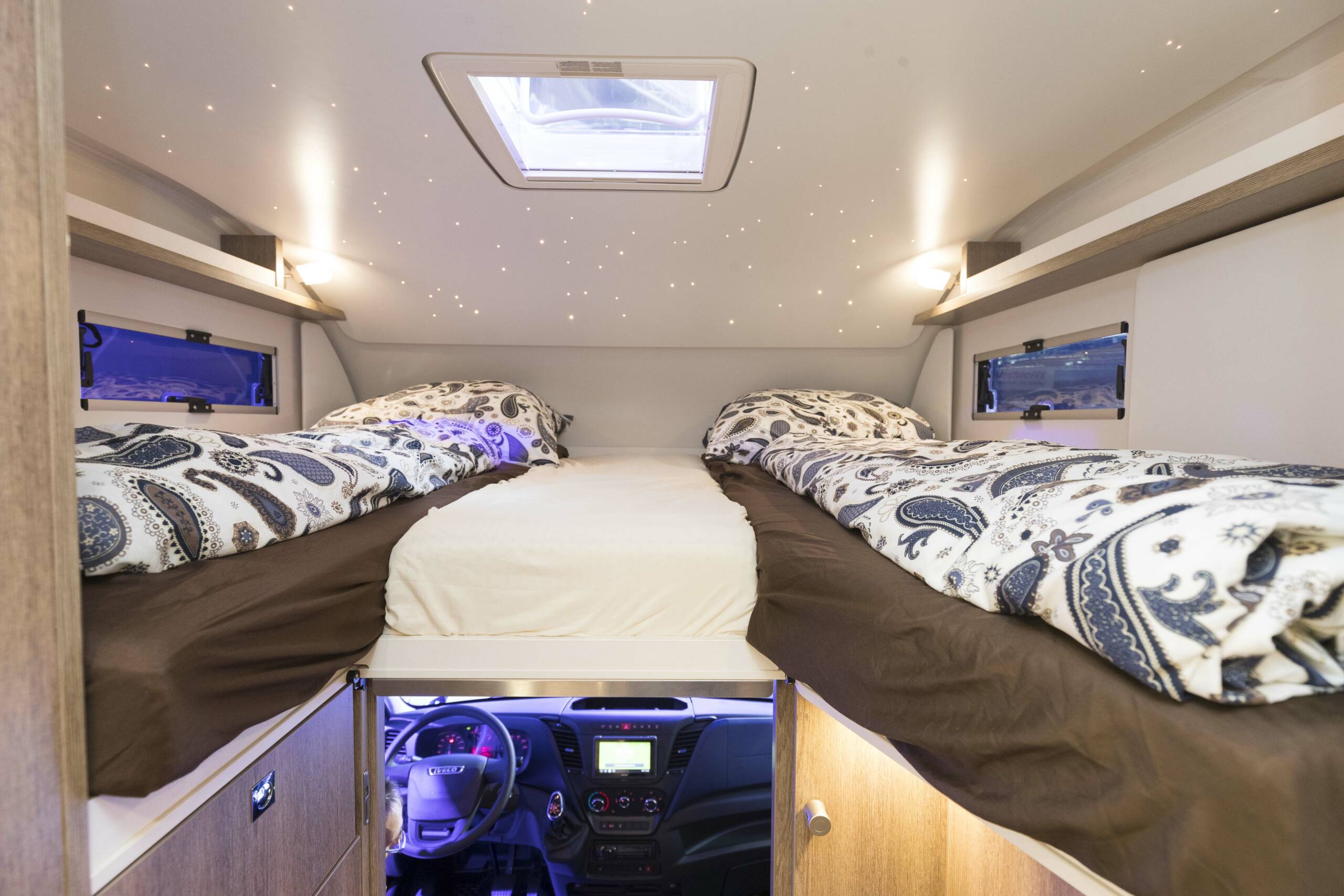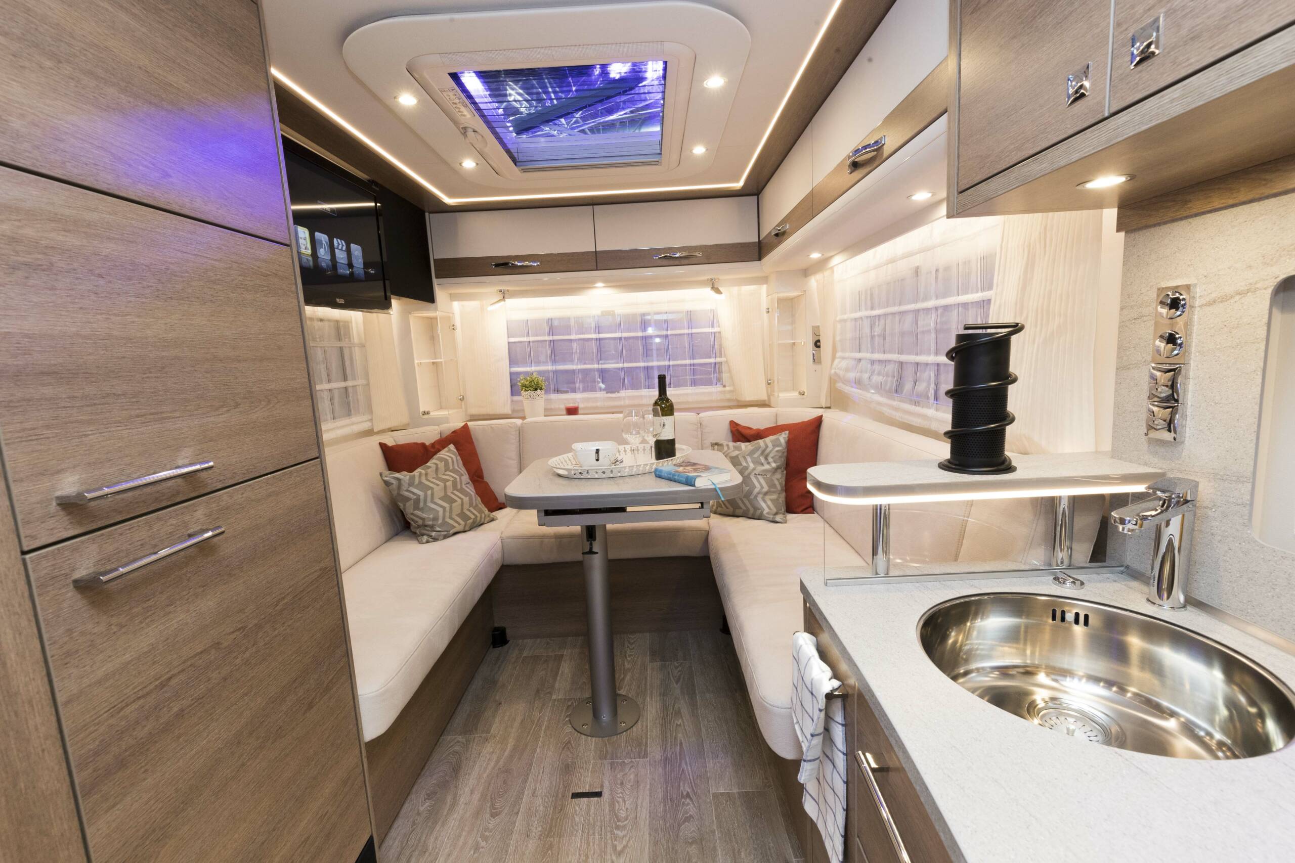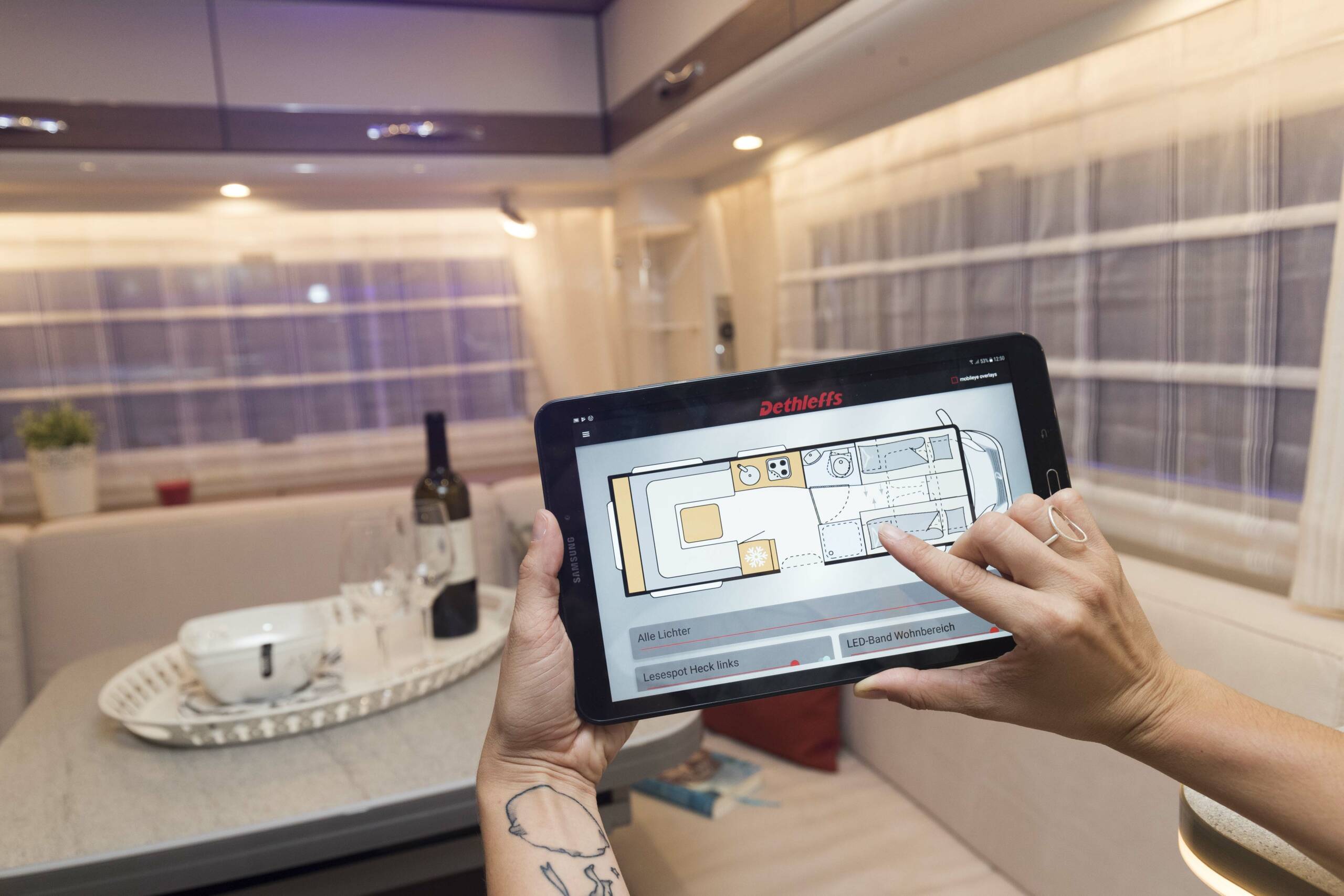 Neben der Elektromobilität integriert Dethleffs auch Konnektivität in die Studie. Über eine App auf dem Tablet, gekoppelt mit dem sprachgesteuerten Modul Alexa von Amazon, lassen sich Licht, Verdunklung und Strom steuern. Laut Hersteller soll das e.home zwei Personen für zwei Tage Autarkie ermöglichen.