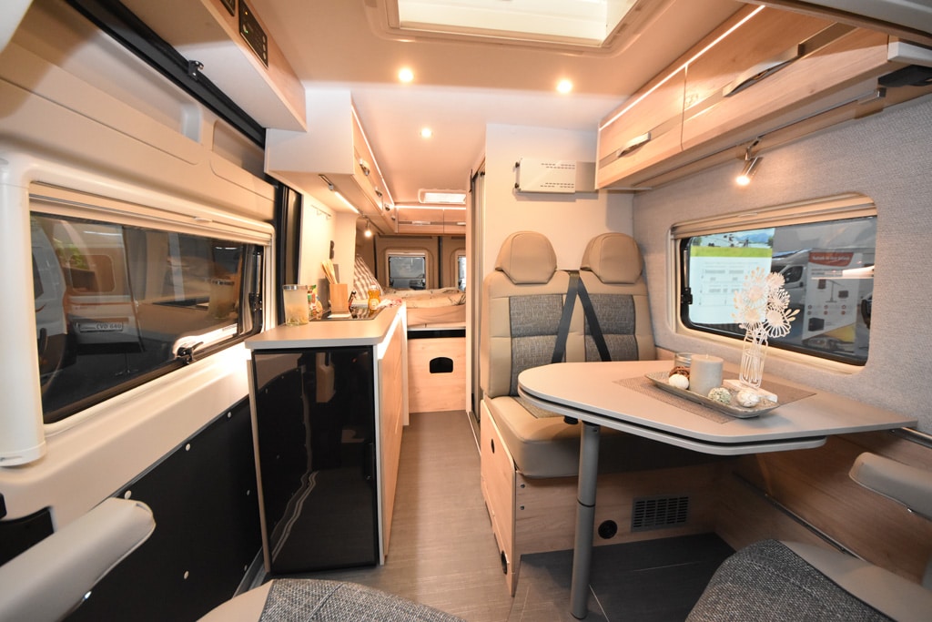 Vor den Betten platziert der Hersteller auf der Fahrerseite ein variables Bad, das sich mit einer Lamellenschiebetür verschließen lässt. Gegenüber steht der Küchenblock an der Schiebetür. Der 84 Liter fassende Kompressorkühlschrank ist in der Stirnseite eingebaut. Camper öffnen ihn bequem von innen wie von außen. Vorn komplettiert eine Halbdinette mit drehbaren Fahrerhaussitzen und einem an der Seitenwand eingehängten Tisch mit ausdrehbarer Zusatzplatte die Einrichtung des Globetrails.