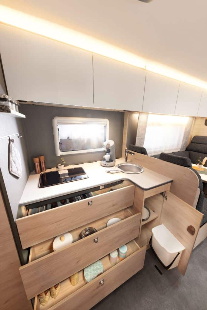 Die Küche wartet mit großen Schubladen, viel Arbeitsfläche, Spülbecken und Zwei-Flamm-Kocher auf. Zur Serienausstattung gehört zudem ein 137 Liter großer Kühlschrank inklusive Gefrierfach und integriertem Backofen.