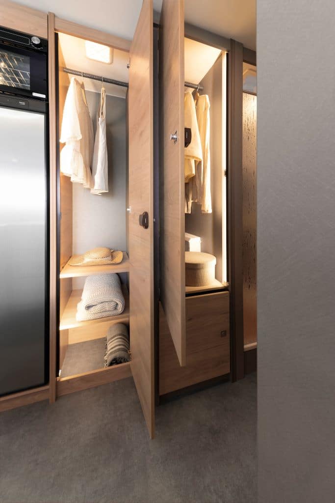 Der 2,09 Meter hohe Wohnraum mit durchgängig ebenem Fußboden bietet auch großgewachsenen Campern ausreichend Kopffreiheit. Graumelierte Polster und ansprechende Holzdekor-Möbel dominieren das wohnliche Innere. Helle Dachschränke mit großem Fassungsvermögen komplettieren das moderne Interieur. Für stimmungsvolle Beleuchtung sorgen serienmäßige LED-Leuchten im gesamten Fahrzeug.