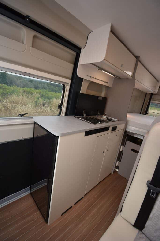 Vor dem variablen Heckbett bleibt der Grundriss klassisch: An der Schiebetür findet sich die Küche mit einer Kocher-Spülen-Kombination und einem in der Stirnseite verbauten Kompressor-Kühlschrank. Zu beachten: die zwei Herdflammen liegen eng an den Rändern und erfordern passende, nicht allzu große Töpfe. Prima: Über dem Kühlschrank bleibt eine große Arbeitsfläche.