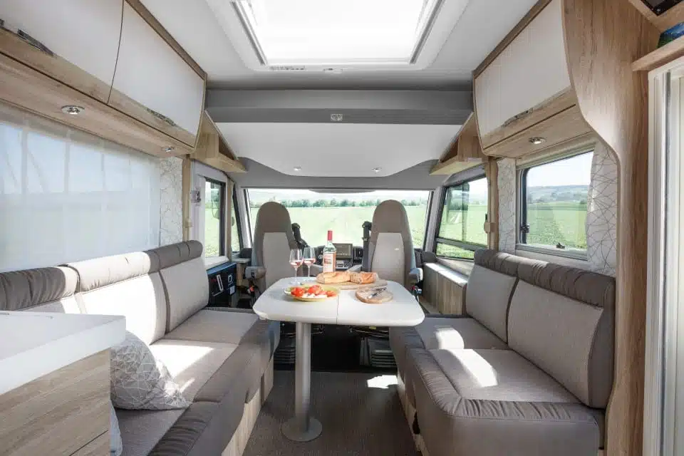 Für die Fahrt entsteht aus beiden Sofas je ein Sitzplatz in Fahrtrichtung mit Dreipunkt-Sicherheitsgurt. Zudem lässt sich die Sitzgruppe zur Liegefläche für zwei weitere Camper umbauen.
