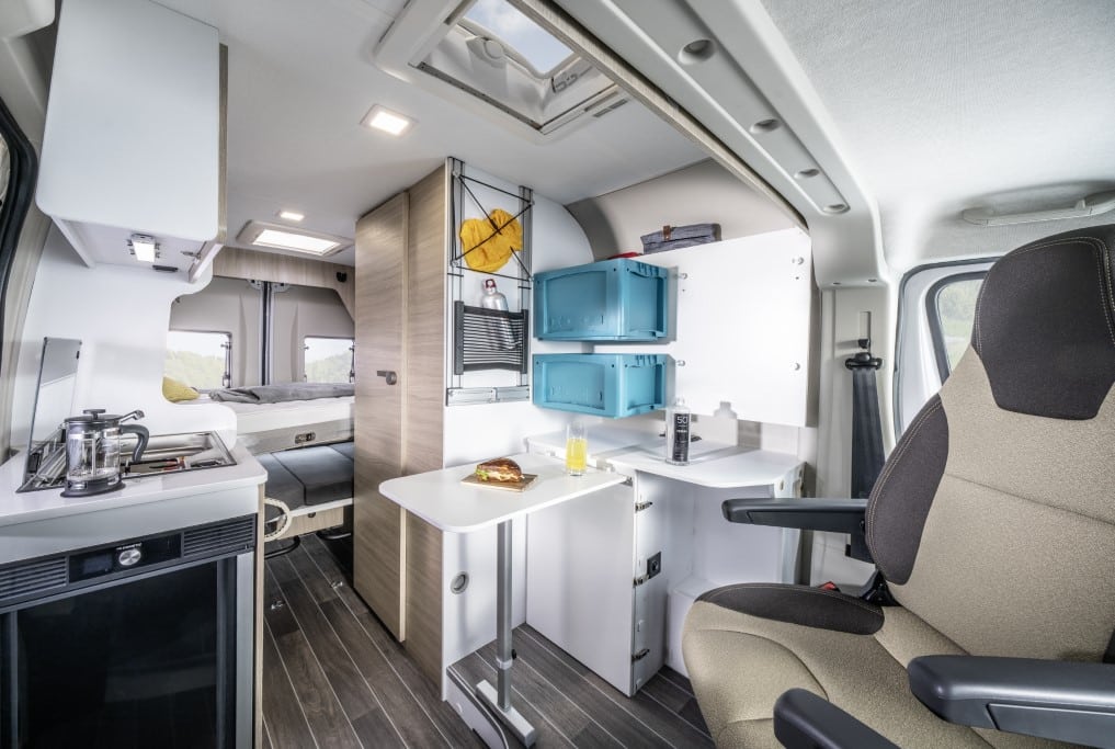 So zum Beispiel hinter dem Fahrerhaus: Wo im Kastenwagen für üblich eine Halbdinette aus Sitzbank und den drehbaren Pilotensesseln entsteht, gibt es ab Werk viel Platz, einen Technikschrank und eine große Ablagefläche und zwei Drehkonsolen für die Fahrerhaussitze. Als Tisch ist das Sideboard lediglich vom Fahrersitz aus erreichbar, den klassischen Tisch zum Einhängen (Foto) bietet Forster optional an.