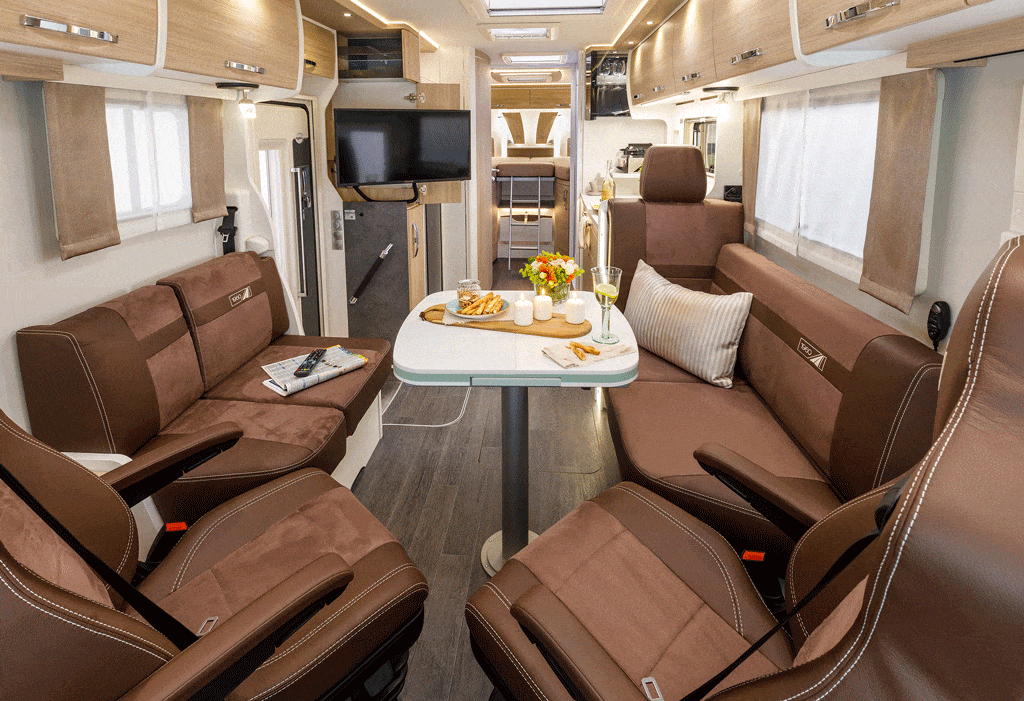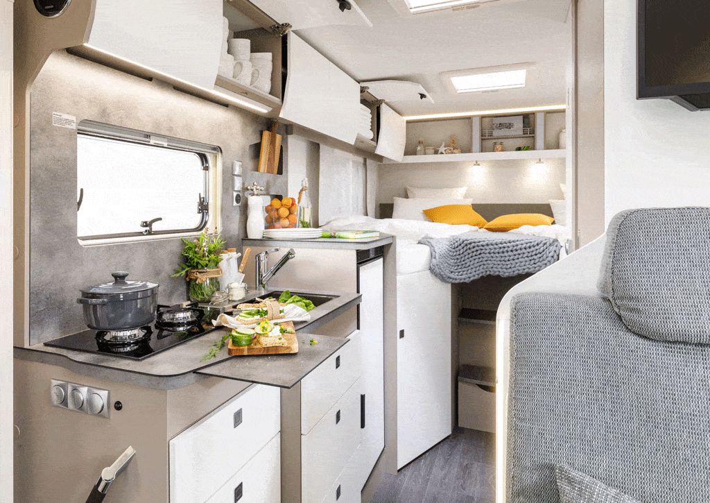 GD und GDK verfügen im Heck über die beliebten Einzelbetten über der Garage. Der Unterschied zwischen den beiden Grundrissen findet sich weiter vorn: Während der GD mit einem zusätzlichen Seitensitz neben der Aufbautür der Sitzgruppe mehr Platz einräumt, setzt Frankia beim neuen GDK auf eine größere Küchenzeile. Der Seitensitz muss dafür weichen, die Aufbautür wandert nach vorn. Das Mehr an Platz für die Küche resultiert in großzügigen Stauräumen und Ablageflächen. Die Preise für Neo GD und GDK beginnen bei 76.900 Euro.