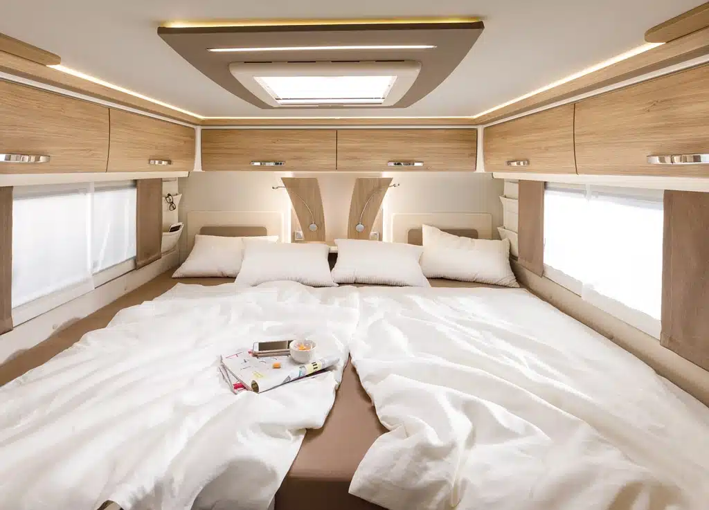 Die Raumaufteilung des Frankia Platin setzt sich aus Heckeinzelbetten zusammen, die sich zur großen Liegewiese ausbauen lassen, großem Vario-Raumbad mit separater Haushaltsduschkabine, großzügig dimensionierter Längsküchenzeile im mittleren Wagenteil sowie einer Gegensitzgruppe im Bug.