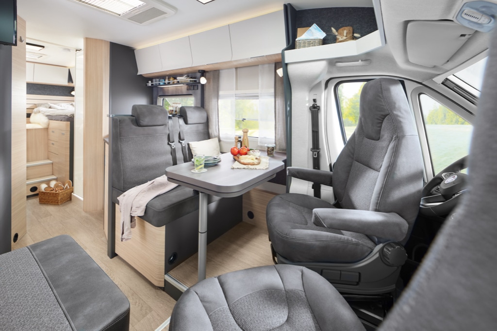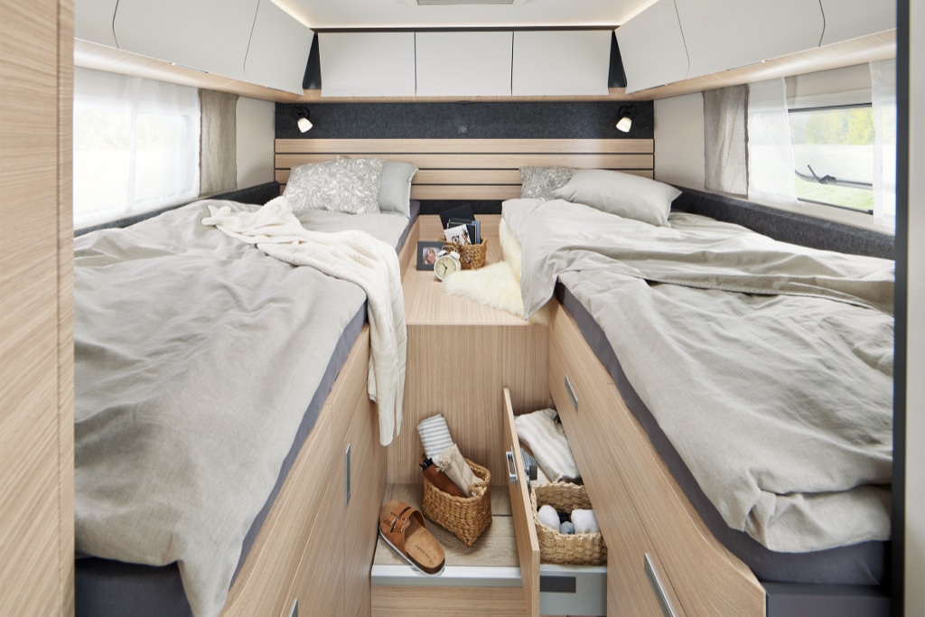 5 unterschiedliche Grundrisse bieten im OPTIMA DE LUXE viel Flexibilität für Familien und Paare. Neben Einzelbetten und einem französischen Bett steht ein Grundriss mit platzsparendem Hubbett zur Wahl. Tagsüber verschwindet das Bett mit wenigen Handgriffen unter der Decke des Wohnmobils.