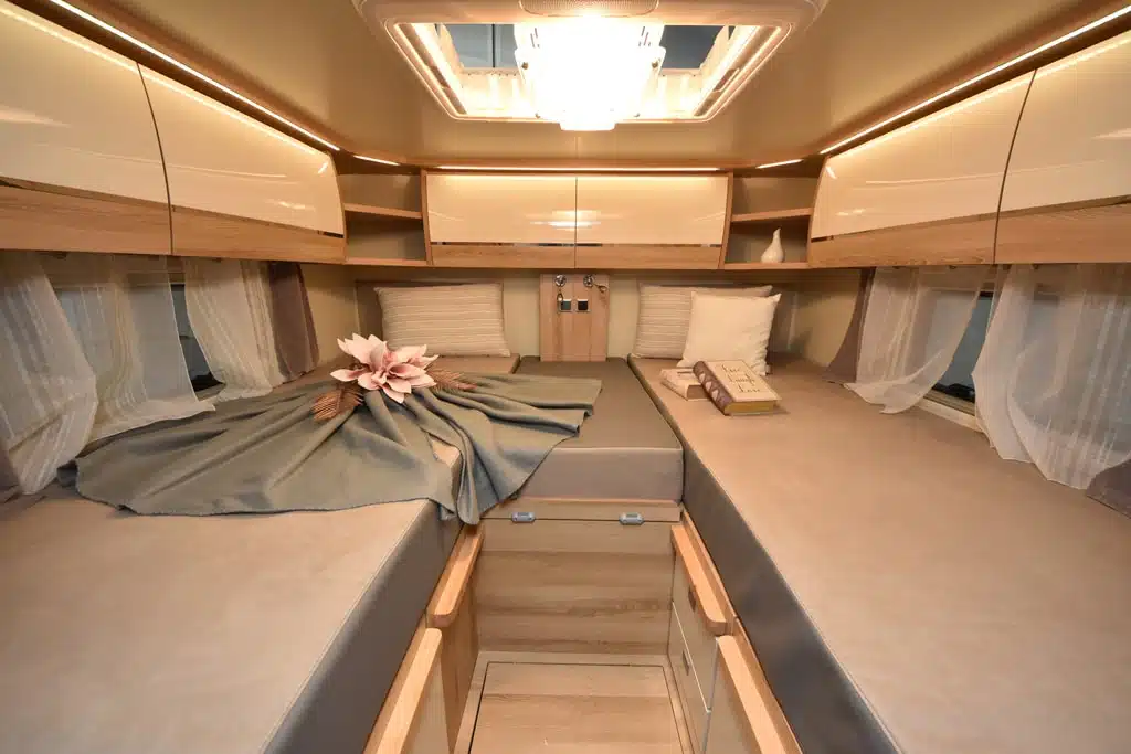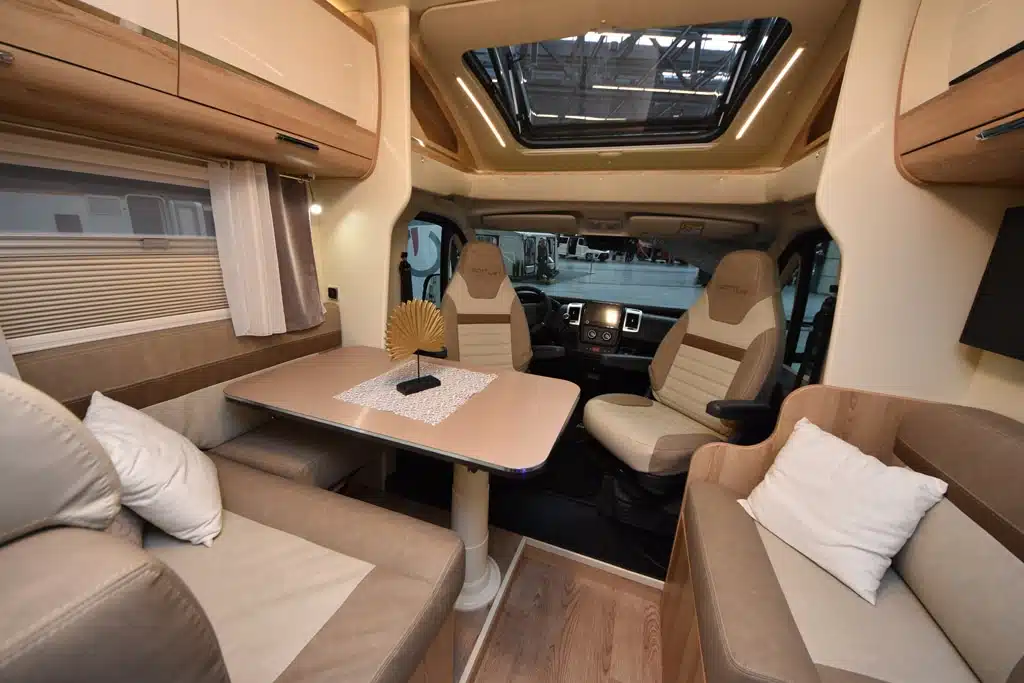Im Innenraum des Giottiline Therry T37S dominieren helle Oberflächen und Polster. Die Sitzgruppe im Bug punktet mit L-Bank und Säulentisch. Die beiden Einzelbetten über der Heckgarage messen 198 mal 83 und 193 mal 83 Zentimeter. Optional gibt es ein Hubbett (196 mal 125 Zentimeter).