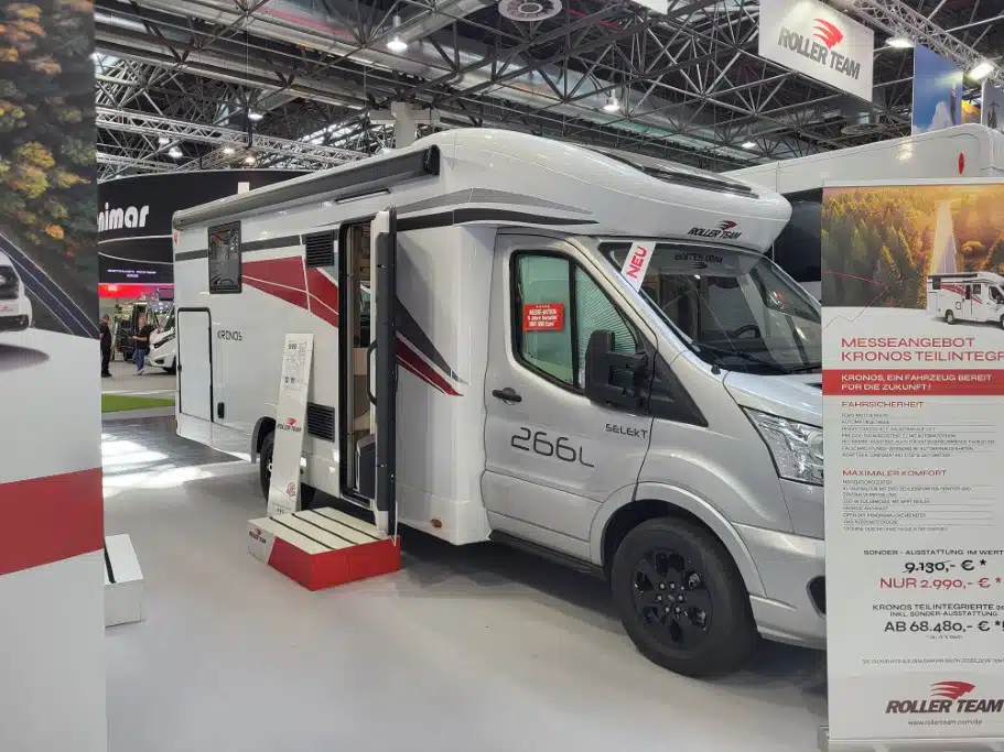 Bei Teilintegrierten bietet Roller Team neun Varianten an. Neu sind die 7,45 Meter langen Kronos 266 TL und 287 TL. Ersterer birgt im Heck ein Queensbett mit davor gelagertem Raumbad samt und mittig im Badezimmer positioniertem Waschtisch. Der Kronos 297 TL wird mit Längseinzelbetten möbliert. Preise ab 65.490 Euro.