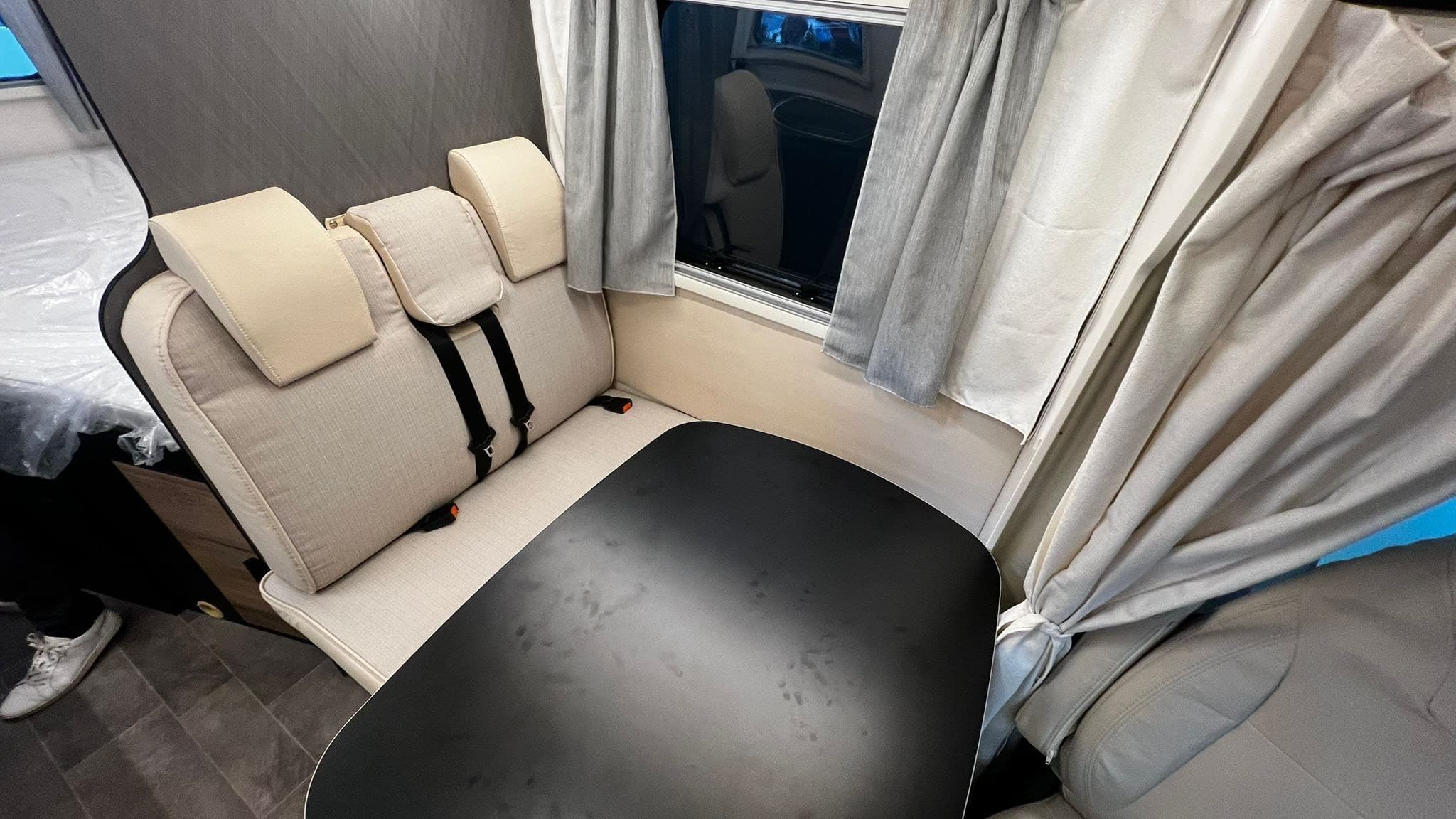 Auf der Fahrerseite schließen sich ein Kleiderschrank und ein Kompaktbad mit integrierter Duschtasse an, auf der Beifahrerseite steht eine ebenfalls kompakte Längsküchenzeile. Im vorderen Wagenteil macht es sich die Zweier-Crew an der klassischen Halbdinette mit drehbaren Frontsitzen gemütlich.