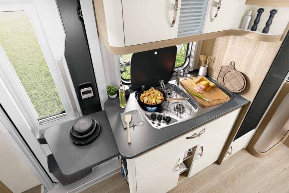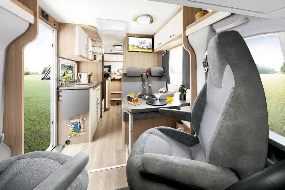 Davor befindet sich auf der Fahrerseite das variable Bad mit integrierter Dusche, gegenüber die Küche mit großem Absorber-Kühlschrank mit 133 Litern Volumen. Im Bug formieren sich Halbdinette und drehbare Vordersitze zu einer gemütlichen Sitzgruppe für bis zu vier Camper.