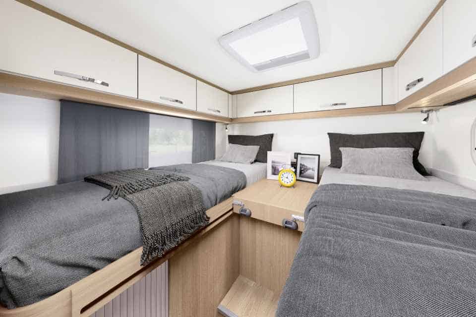 Der Grundriss des Hobby Optima Ontour Edition F ist ein alter bekannter: er entspricht dem V 65 GE auf Citroën. Trotz deutlich unter sieben Meter Aufbaulänge herrscht viel Platz im Wohnraum. Über der Heckgarage baut Hobby klassenüblich zwei Einzelbetten in Längsrichtung ein. Sie lassen sich per Einlegepolster zum Doppelbett erweitern.