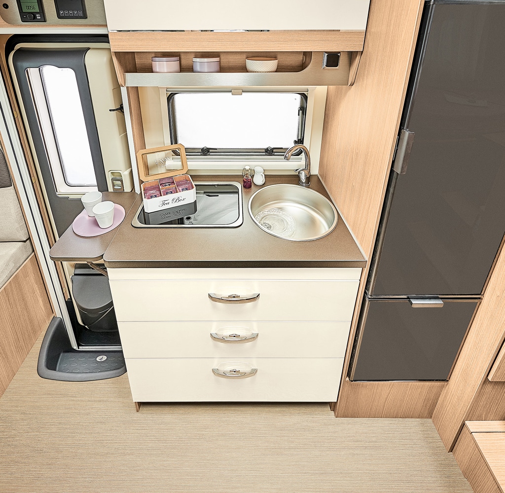 Der Mittlere im Bunde ist der Itineo PJ700. Er ist 6,99 Meter lang, und über seiner Heckgarage baut die Rapido-Tochter aus dem französischen Mayenne zwei Einzelbetten ein. Davor stehen sich das Bad mit integrierter Dusche und die Küche gegenüber.