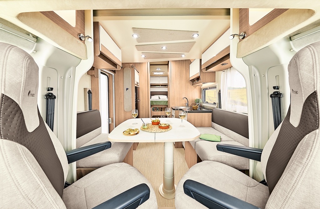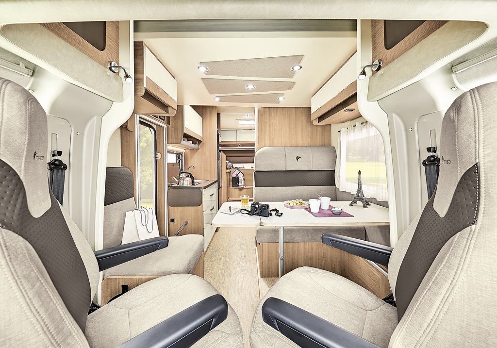 Vorne formiert sich die Sitzgruppe aus der Sitzbank mit zwei Dreipunkt-Sicherheitsgurten, den drehbaren Vordersitzen, dem Seitensitz neben der Aufbautür sowie dem an der Seitenwand eingehängten Tisch.