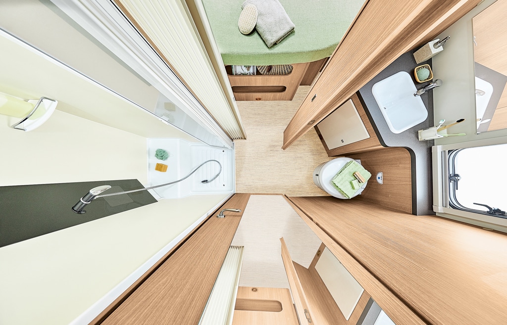 Größtes Modell in dem neuen Trio ist der Itineo PM740. Wie es sein Name vermuten lässt, ist das Fahrzeug 7,40 Meter lang. Im Heck machen es sich zwei Personen im Queensbett über der Garage bequem. Zwei Kleiderschränke flankieren das Kopfende dieser Liegefläche. Vorm Schlafzimmer installiert Itineo ein Raumbad mit separater Dusche.
