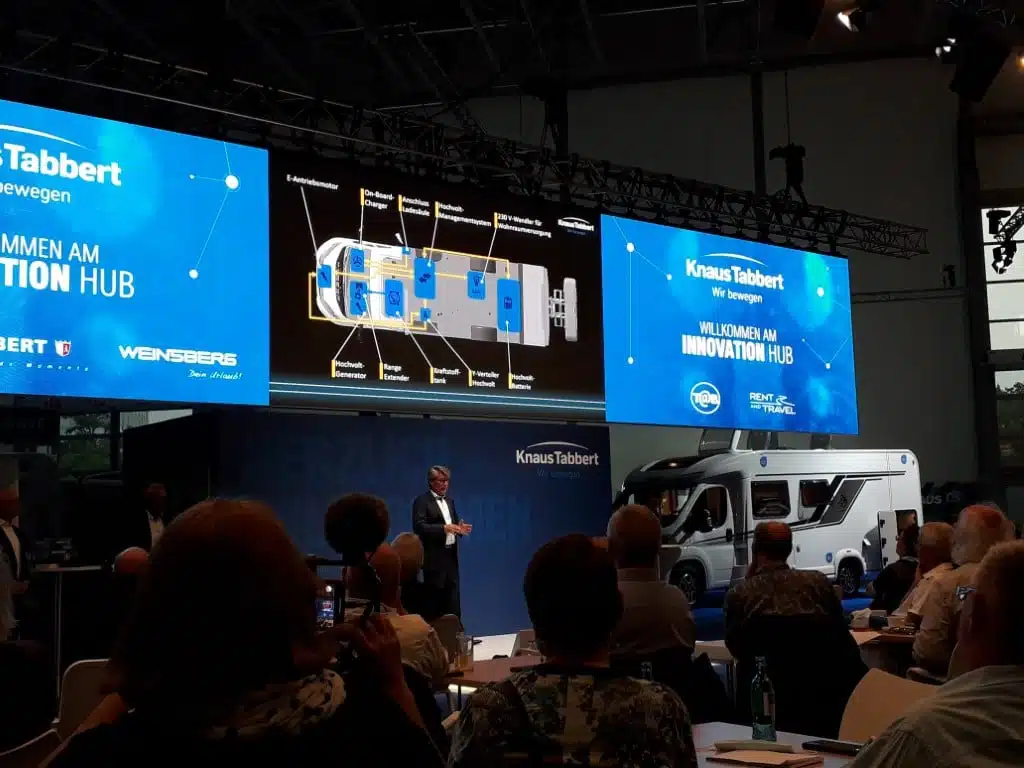 Bei der Präsentation rollte der Knaus E.Power Drive tatsächlich vollelektrisch leise surrend in die Halle ein. Der E-Motor leistet 180 kW und soll eine Reisegeschwindigkeit von 110 km/h ermöglichen. An einer öffentlichen Wallbox soll die Ladezeit rund drei Stunden betragen.