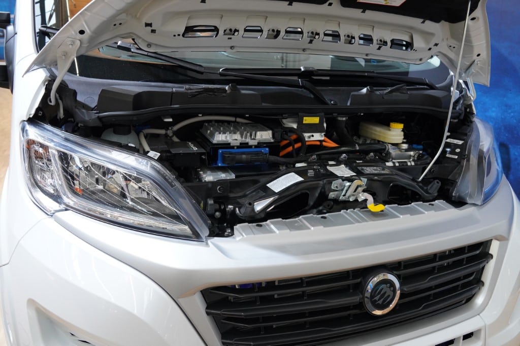 Bis auf die E.Power Drive-Embleme auf der Motorhaube, seitlich an den Kotflügeln und am Heck weist optisch nichts auf den E-Antrieb hin. Im Cockpit fällt der fehlende Schalthebel auf, hier sind stattdessen Drucktasten zur Steuerung des Antriebs platziert. Der Innenraum stammt aus dem bekannten und beliebten schmalen Teilintegrierten Van Ti 650 MEG Vansation – ein rund sieben Meter langes Mobil mit Einzelbetten über der Heckgarage. Knaus hat sich zum Ziel gesetzt, eine Serienversion des E.Power Drive auch als 3,5-Tonner anzubieten. Es soll aber auch Varianten mit mehr Zuladung geben.
