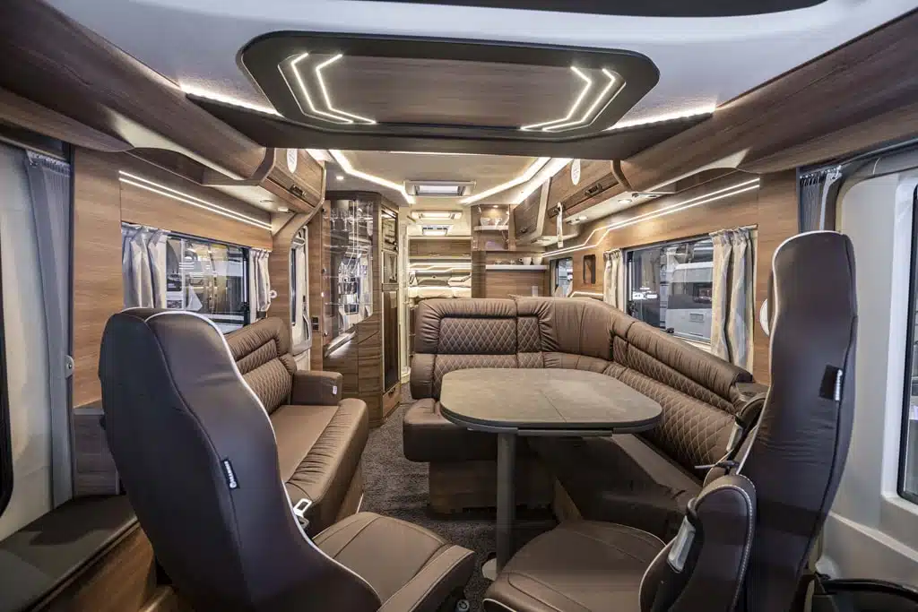 Auch im Innenraum setzt der große Integrierte optische Akzente. Besonders stolz ist Knaus auf die in Wände und Möbel integrierte Beleuchtung, die die fließenden Linien des Interieurdesigns betonen soll. Ein mattes Holzdekor, Möbelgriffe in Schwarz- Chrom sowie Küchenarbeitsfläche und Esstisch in Dunkel verkörpern zeitlose Eleganz. Die Polster der Sitzgruppe sind auf Wunsch mit Echtleder bezogen. Hinzu kommt ein Fußboden in Yacht- Optik. Darunter installiert Knaus die Technik im beheizten Doppelboden, der zudem viel Stauraum bereithält.