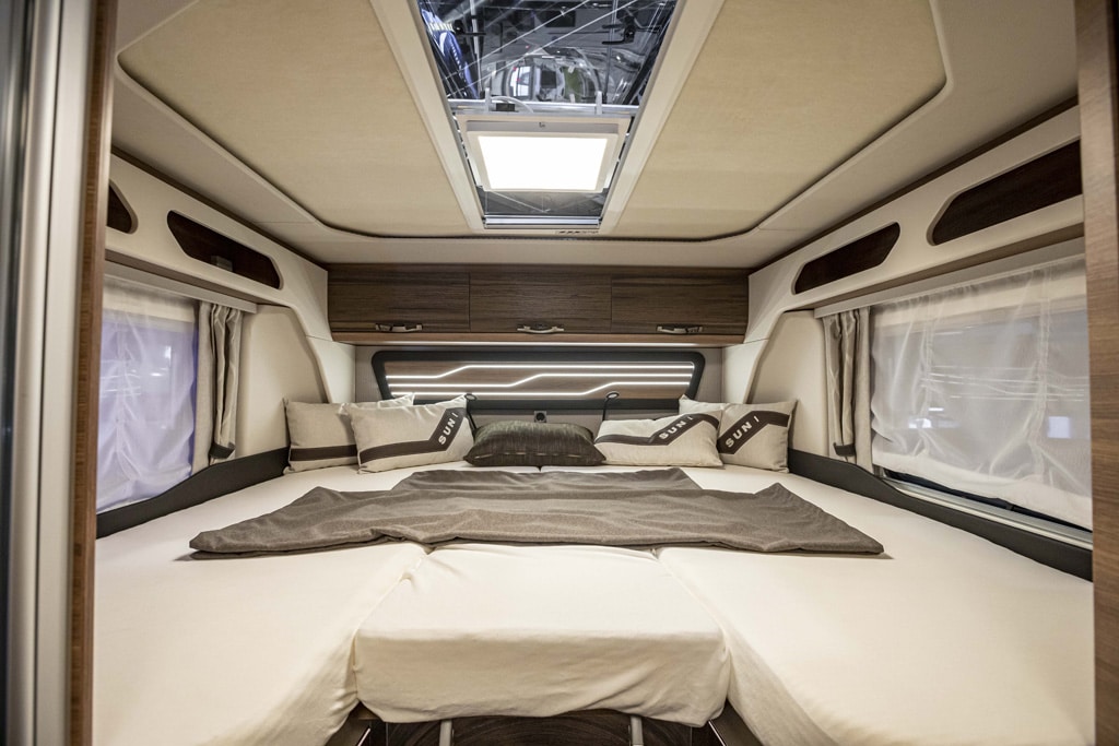 In der Küche des Knaus Sun I steht ein großer 177-Liter-Kühlschrank bereit, dessen Tür sich dank Doppelanschlag zu beiden Seiten öffnen lässt. Je zwei Urlauber schlafen im Heck auf Einzelbetten (900 LEG) oder im Queensbett (900 LX) sowie im Hubbett über dem Fahrerhaus. Grundpreis des Sun I: 112.978 Euro.
