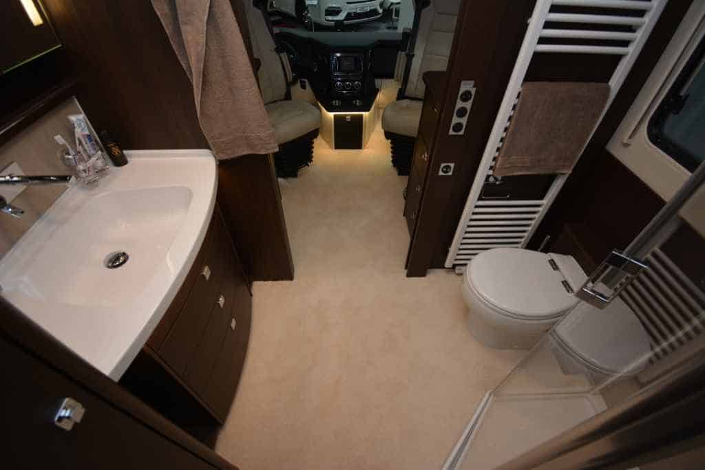 Die Duschkabine mit den erwähnten Echtglas-Türen findet sich ebenfalls auf der Beifahrerseite und bietet reichlich Bewegungsfreiheit unter der Brause. Das Bad lässt sich nach vorn und hinten mittels Schiebetüren abtrennen.