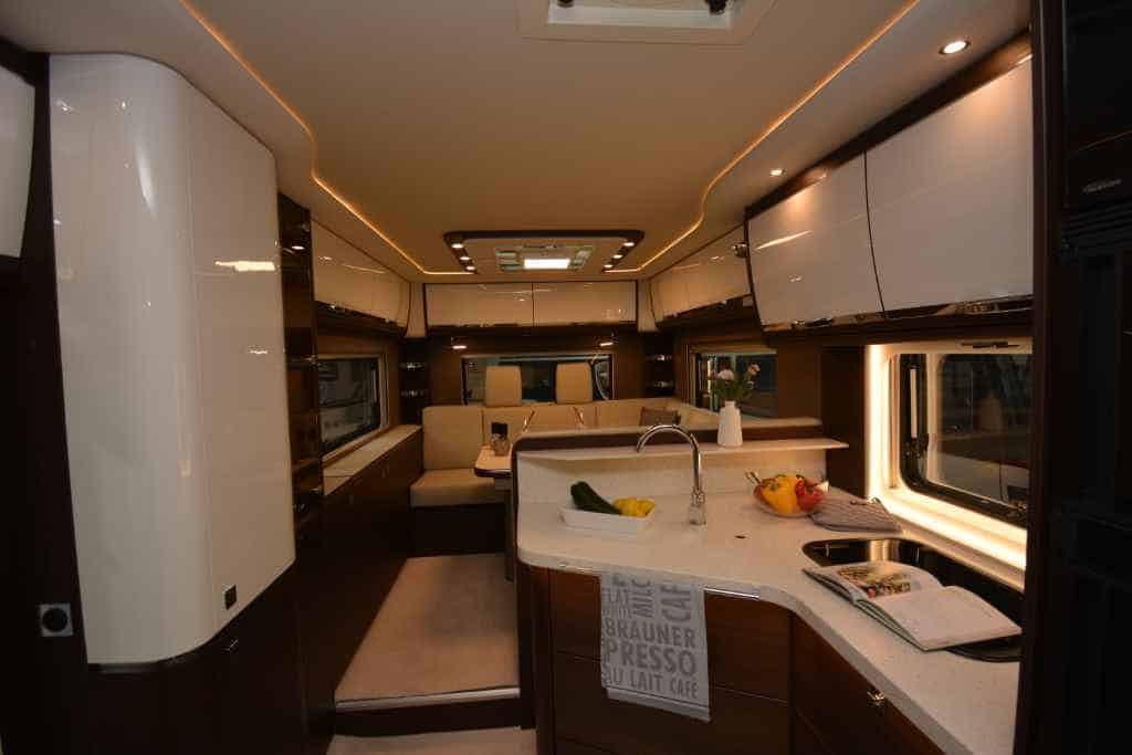 Auf 8,99 Meter Länge bietet der Liner nicht nur an besagter Rundsitzgruppe, sondern auch an der sich nach vorn anschließenden Küche und im Raumbad mit separater Dusche mit Echtglas-Kabine Platz im Überfluss. Zum hervorragenden Raumeindruck trägt auch die Breite des Fahrzeugs von 2,40 Meter bei – das sind immerhin rund zehn Zentimeter mehr als bei herkömmlichen Wohnmobilen üblich.