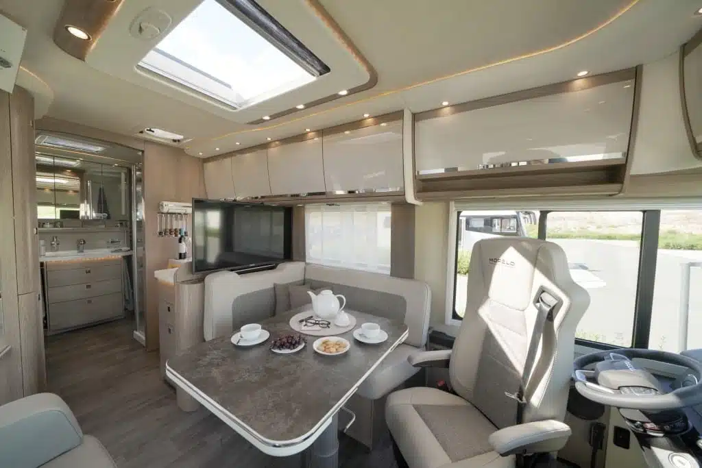 An die Küche schließt sich nach vorne eine Winkelsitzgruppe mit gegenüberliegendem Sofa an. Selbstverständlich ist der 88 G mit einer Warmwasserheizung ausgestattet. Den großzügigen Innenraum verdankt er der speziellen Konstruktion des hochgesetzten und nach vorne verschobenen Fahrerhauses. Deshalb besitzt der Morelo Palace 88 G auch einen üppigen Doppelboden, in dem die Bordtechnik und Tanks untergebracht sind.