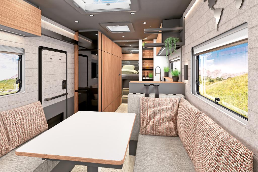 Der neue Arto 84 rollt auf Mercedes-Benz Sprinter mit Al-Ko-Vario-Tiefrahmenchassis und vereint die Kompaktheit des Arto 78 mit dem Luxus des Arto 88. Auf 8,45 Metern überzeugt er mit einem großen Raumbad, einer Längsküche, Einzelbetten im Heck und einer komfortablen Gegensitzgruppe im Bug.