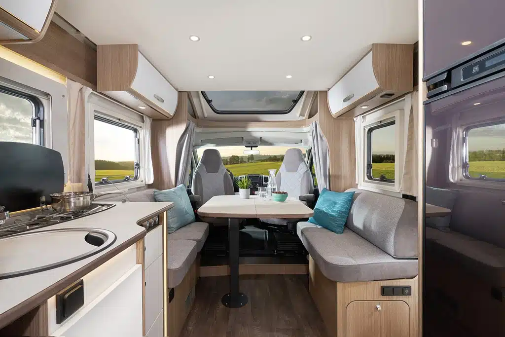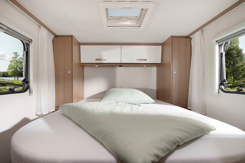 Der zweite neue Grundriss ergänzt die Van-Serie der schmalen Teilintegrierten. Der V 339 ist 6,86 lang und verfügt im Heck über ein Queensbett. Trotz des 2,14 Meter schmalen Aufbaus ist die Liegefläche immerhin 1,40 Meter breit. Für mehr Privatsphäre lässt sich das Schlafabteil mit einem Faltvorhang abtrennen. Der Grundpreis des V 339 liegt bei 38.899 Euro. Die Vans, zu denen auch die Modelle V 132 mit Querbett und V 337 mit Einzelbetten gehören, sind zudem weiterhin als umfangreich ausgestattete Europa Edition erhältlich.