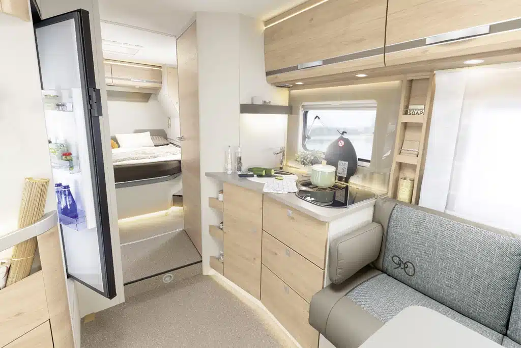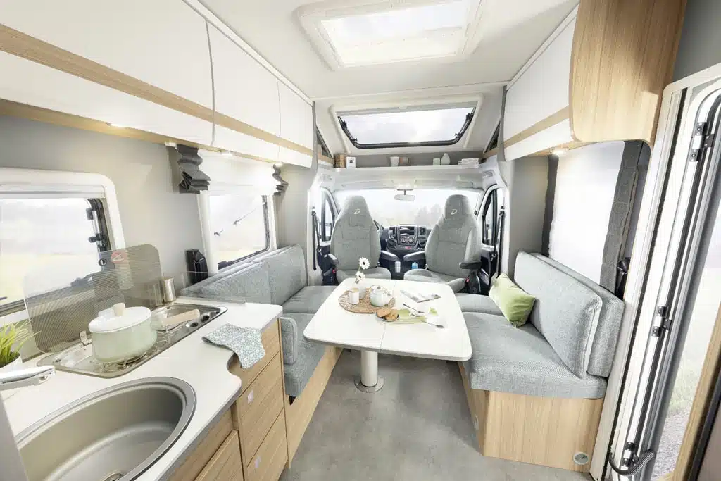 Beide Teilintegrierte basieren auf dem Fiat Ducato mit Werkstiefrahmenchassis und sollen mit viel Serienausstattung überzeugen. Der Just 90 kostet ab 48.599 Euro und soll in erster Linie Einsteiger ansprechen. Zu diesem Preis gibt es die kürzeren, knapp unter sieben Meter langen Modelle T 6812 EB mit Einzelbetten und T 6752 DBL mit Queensbett und Face-to-Face-Sitzgruppe. Lederlenkrad, Klimaanlage im Fahrerhaus, Tempomat, Fenster in der T-Haube und eine 70 Zentimeter breite Aufbautür mit Zentralverriegelung sind bei jedem Just 90 an Bord. Optional bietet Dethleffs Pakete etwa mit Sat-Anlage, TV und Markise. Das Programm der Sonderbaureihe ergänzen vier Grundrisse auf 7,40 Meter Fahrzeuglänge – zwei mit Einzelbetten und zwei mit Queensbett, wahlweise mit L-Sitzgruppe oder gegenüberliegenden Längssofas (Face-to-Face).