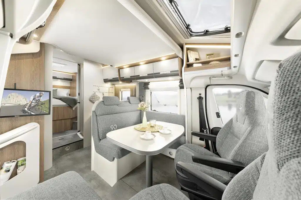 Die großzügig ausgestattete Sonderserie basiert auf dem Citroën Jumper mit originalem Tiefrahmenchassis, 165-PS-Turbodiesel und Fahrerhaus-Klimaautomatik. Die Bodenplatte des Aufbaus ist holzfrei und besteht an ihrer Unterseite aus einer GfK-Schicht. Aus diesem Material besteht auch die Dachoberseite. Die Wände fertigt Dethleffs aus Alu-Sandwich. Rahmenfenster sind ebenso Serie wie das Fenster und die Zentralverriegelung für die 70 Zentimeter breite Aufbautür. Auch das Skyroof in der Dachhutze ist in jedem Trend 90 eingebaut. Zudem montiert Dethleffs im Fahrerhaus Verdunklungsplissees und drehbare, in Höhe und Neigung verstellbare Vordersitze mit je zwei Armlehnen.